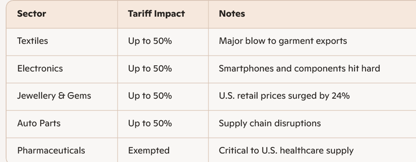 - Tariffs: Three waves of duties imposed between April and August 2025, targeting Indian exports.